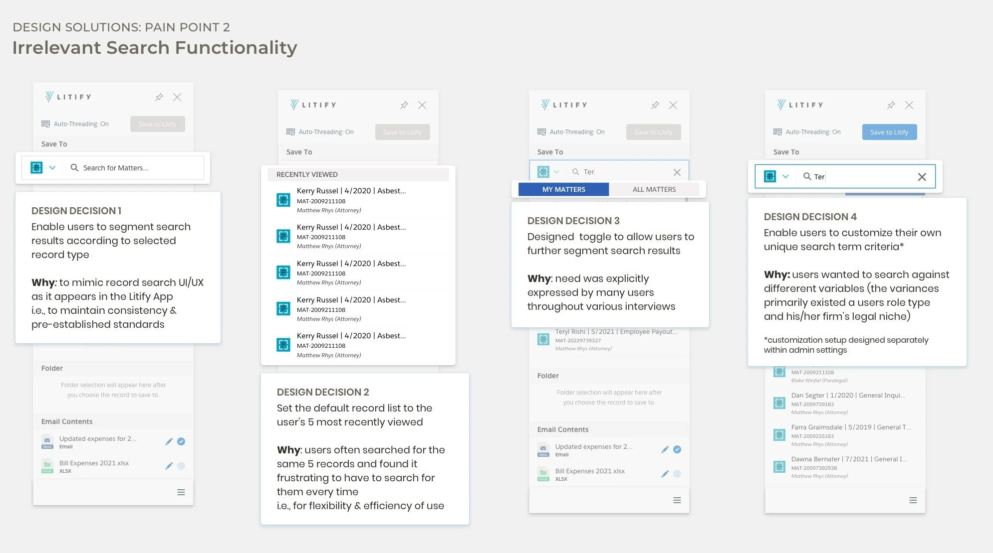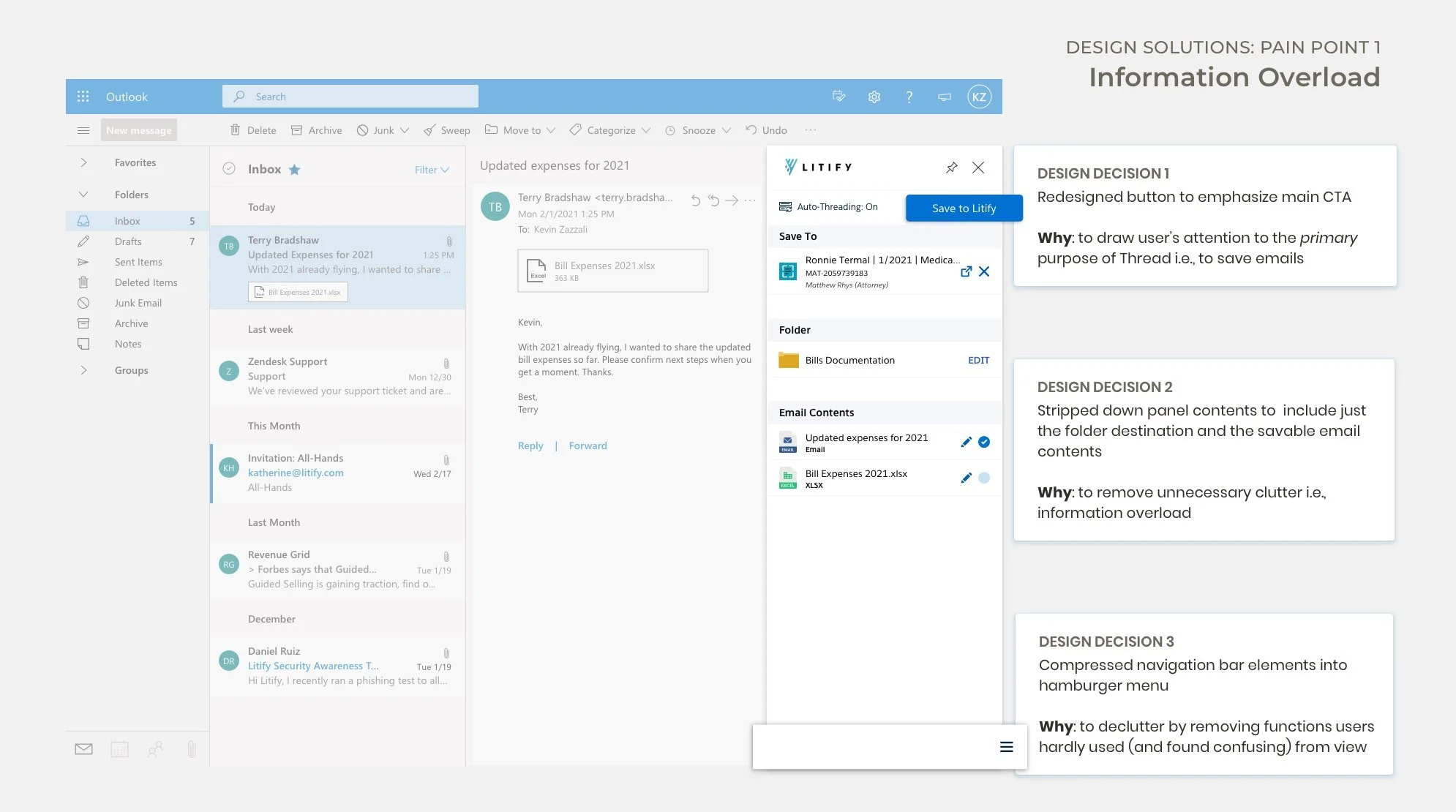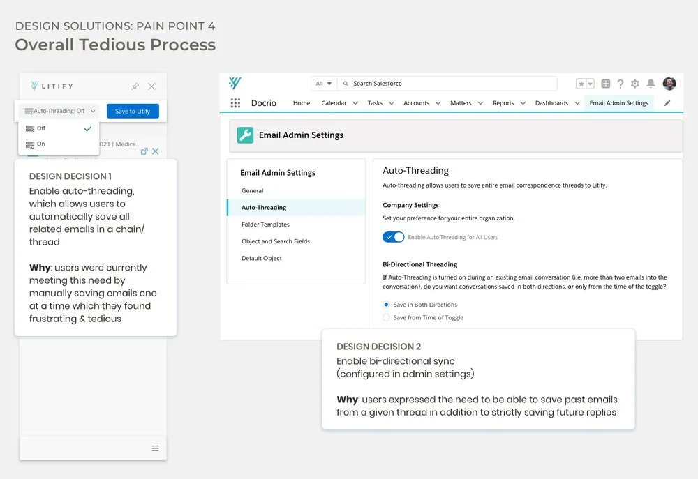 To offer a comprehensive solution to all the problems associated with Inbox, Litify decided to build its own email integration solution—called Thread—and chose me to spearhead the project from a UX standpoint.