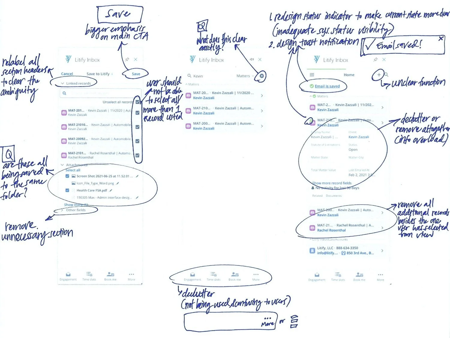 It was clear early on from user feedback, that saving emails to Litify was a tedious—and often unreliable—process. My primary goal during the initial research was to learn about Inbox users’ central need for a reliable email-syncing tool—and how different users were currently satisfying this need.