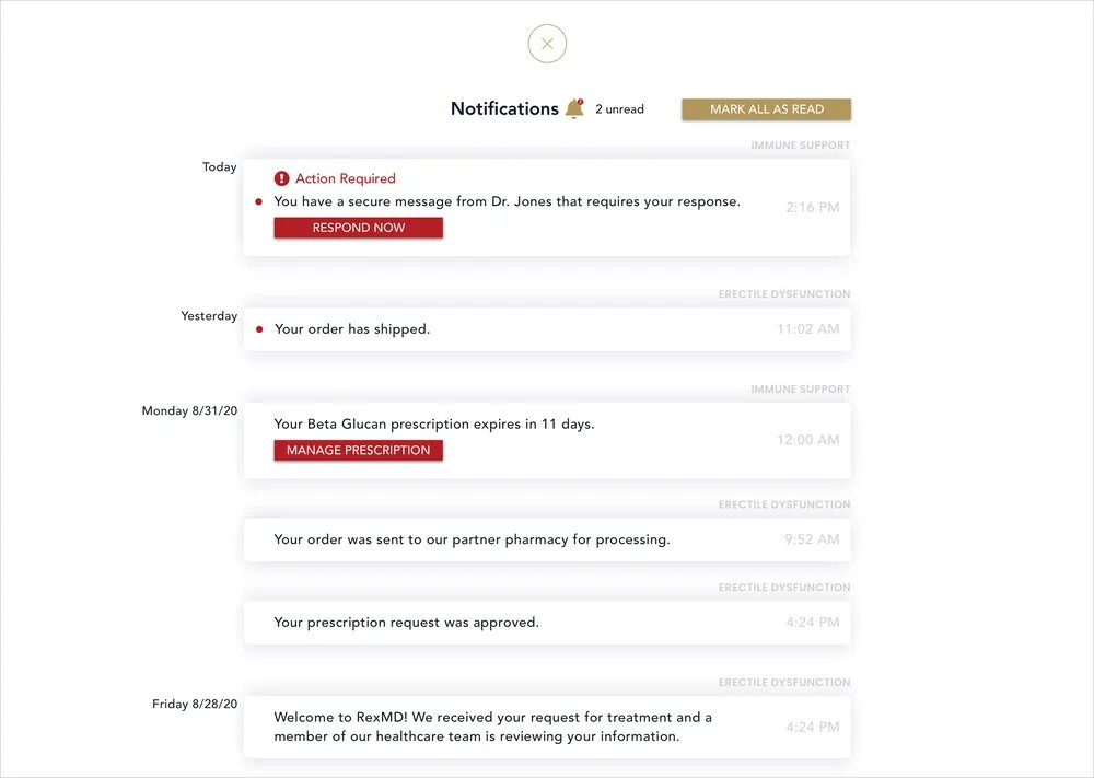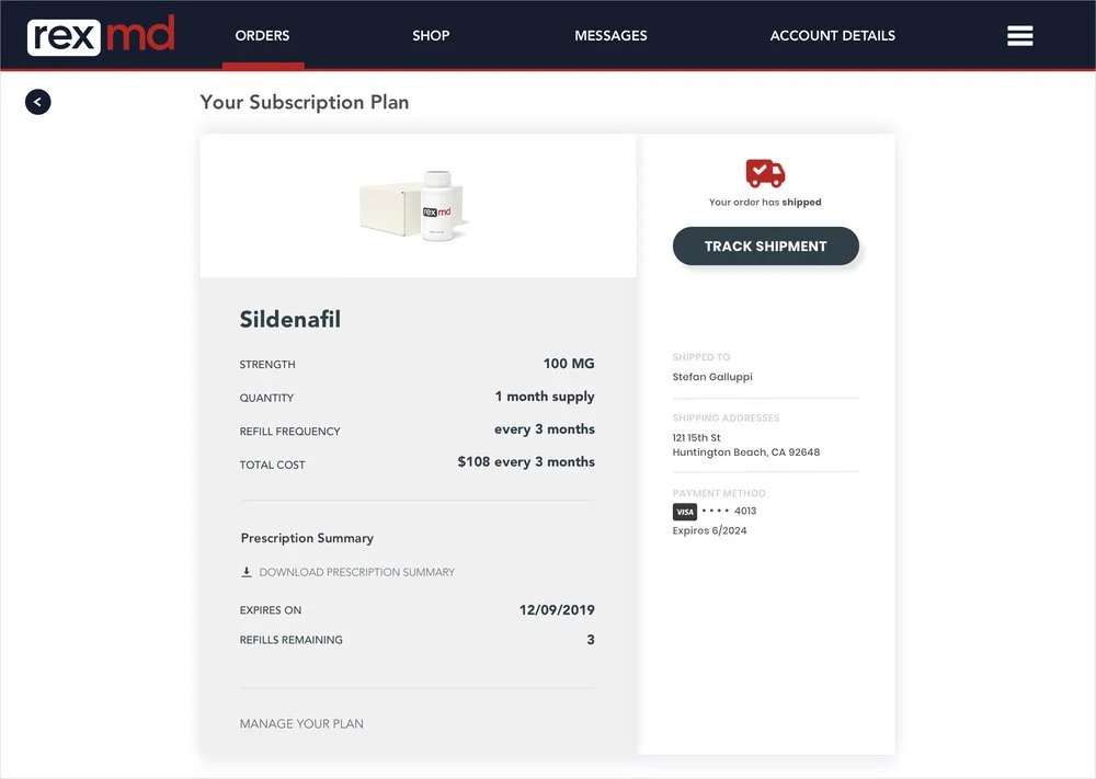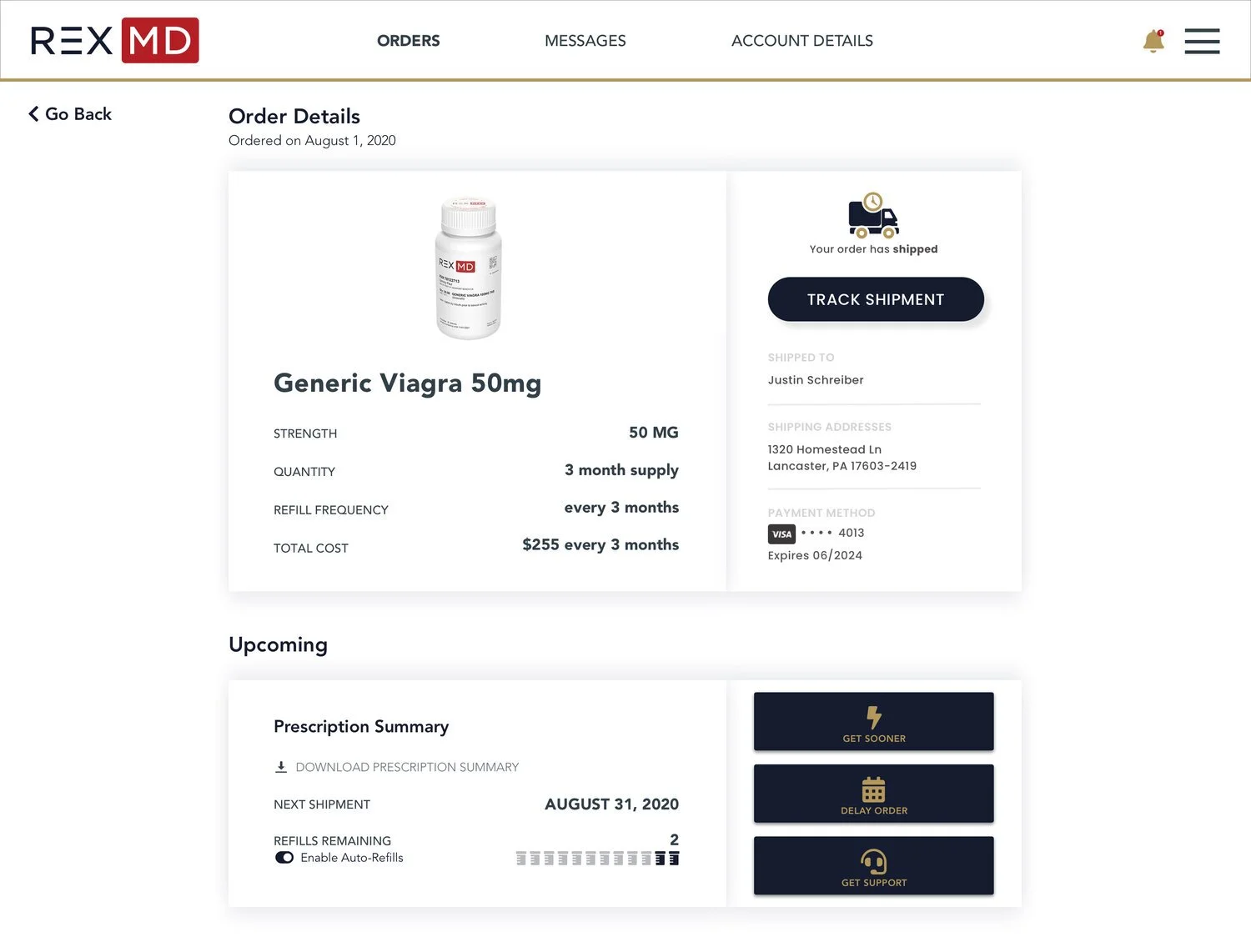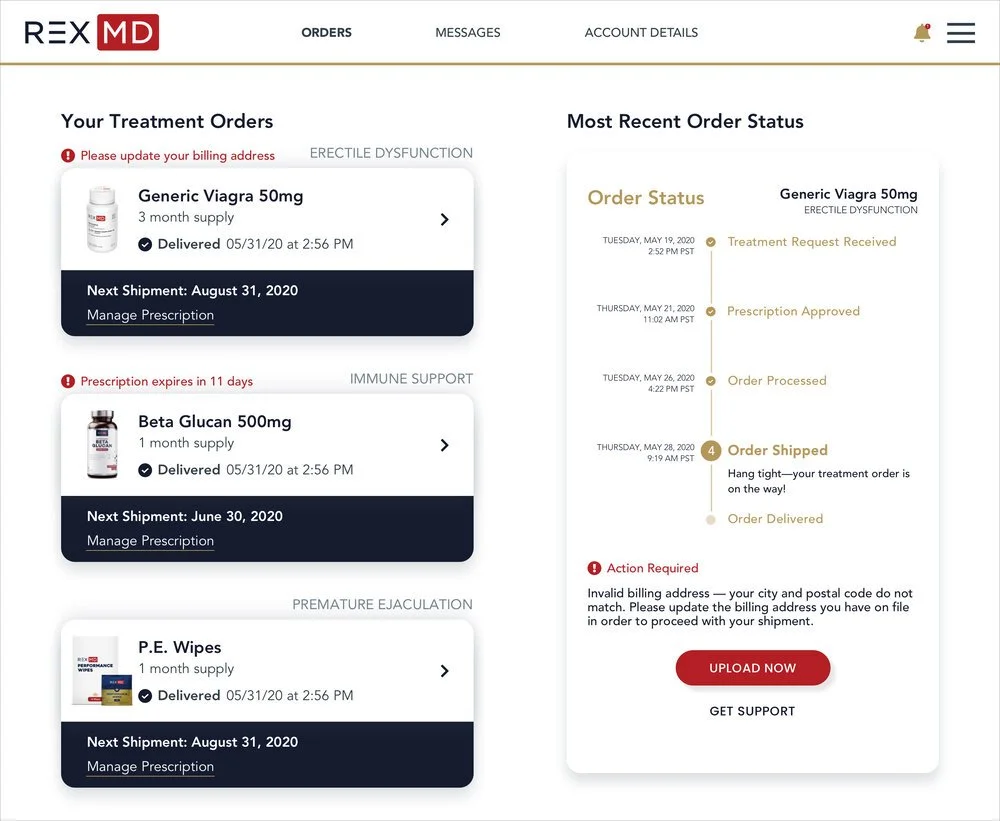 Background: RexMD is a male-oriented healthcare provider that specializes in E.D. treatment. I was tasked with redesigning RexMD’s patient portal where users could manage their accounts, subscription preferences, and all orders. The main goal for this redesign effort was to reduce the volume of customer-support tickets coming in from our users.