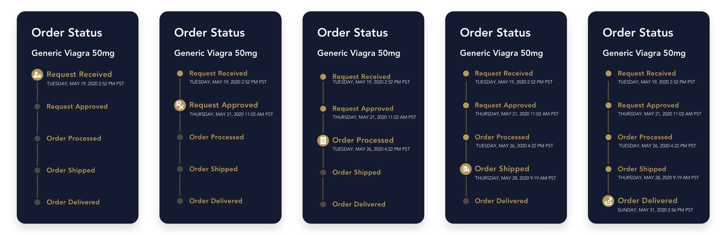 I laid out each step in sequential order and used icons to highlight the current status. After several hand-drawn sketches exploring both horizontal and vertical orientations, I opted for the latter as it not only optimized real estate but also offered more flexibility in adding additional elements such as the timestamps shown here. I included the timestamps so that users could make sure the process was moving along as expected, and also to offer a useful point of reference on timing for future deliveries.